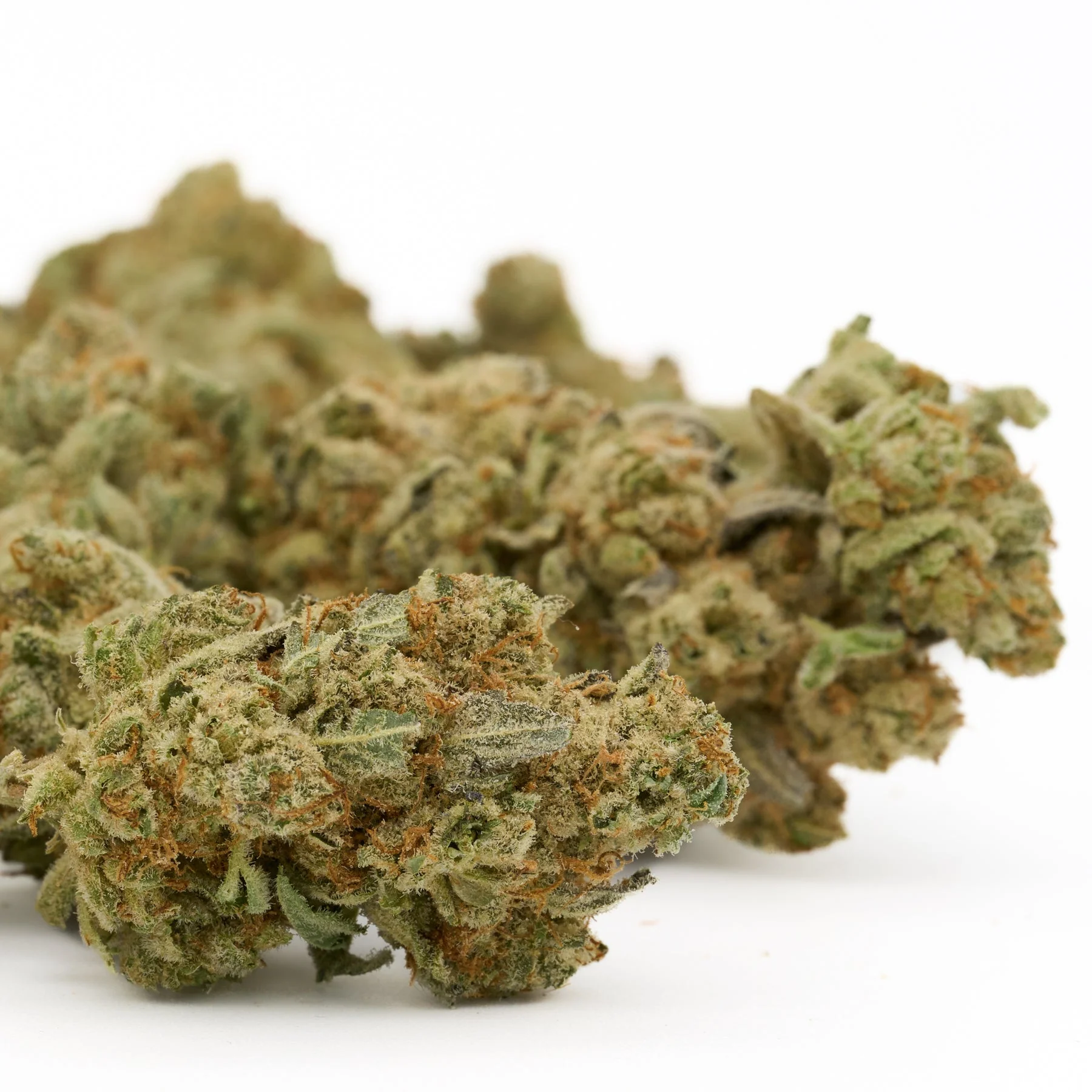 The buds are typically dense and chunky, displaying deep green coloration accented by bright orange pistils. A thick coating of frosty trichomes covers the flower, reflecting strong resin production and attentive cultivation practices.