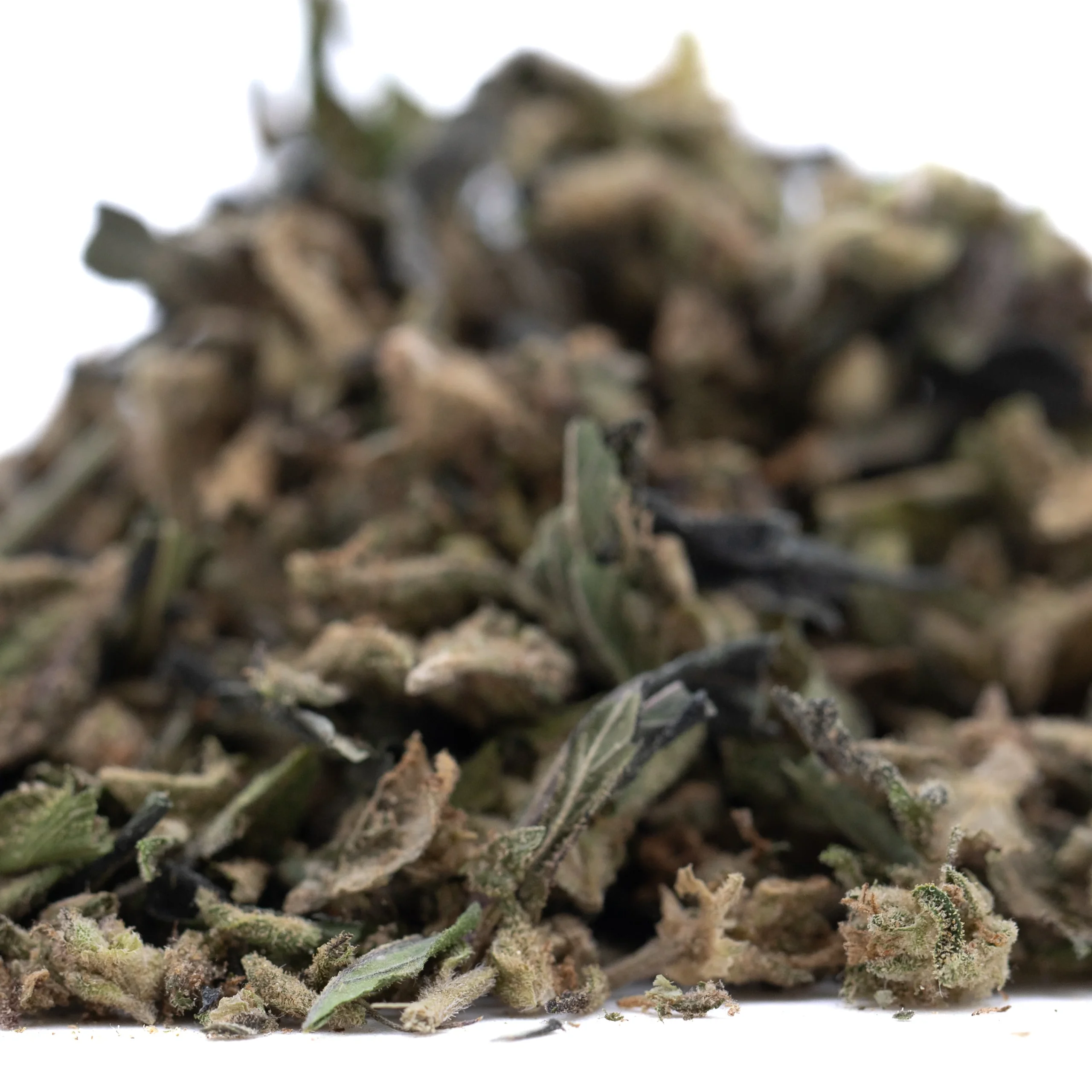 The presence of trichomes reflects the cannabinoid-rich resin found across the plant material.